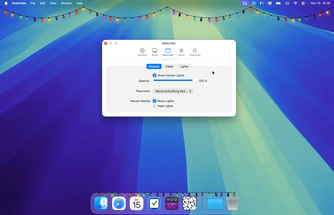 - ๐ฅ๏ธ Show festive lights in the dock, under the menu bar, or both.